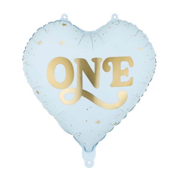 Foil balloon Heart ''One'', in light blue with golden print. Size after inflation approx. 35 cm (14''). Suitable for air and helium inflation. Set includes a straw.