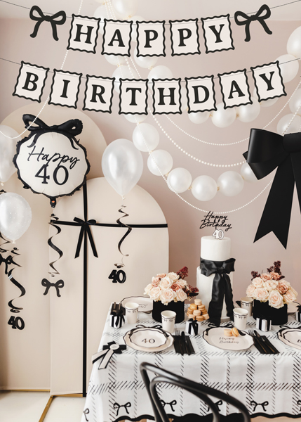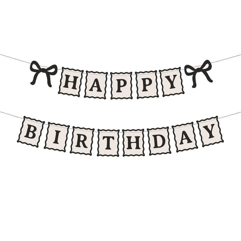 'Happy Birthday” banner with bows in cream and black, 100 cm long. Ready to use straight from the packaging. The paper banner is stitched together with a black string.