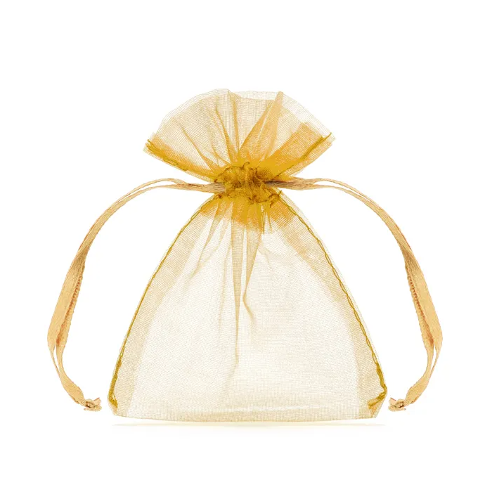 Drawstring bags made of smooth organza in gold, dimensions 7.5 x 10 cm. Perfect for wedding guests.(1 pack / 20 pcs.)