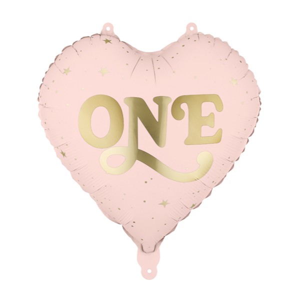 Foil balloon Heart ''One'', in light pink with golden print. Size after inflation approx. 35 cm (14''). Suitable for air and helium inflation. Set includes a straw.