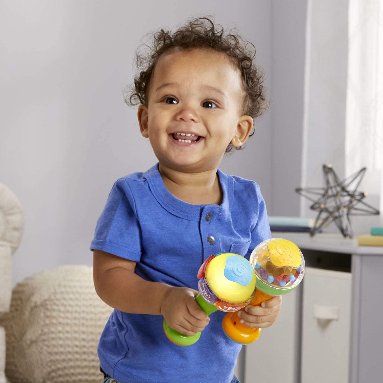 The electronic maraca features a light-up dome that changes colors with the music and plays sound effects; the other includes colorful shaker beads