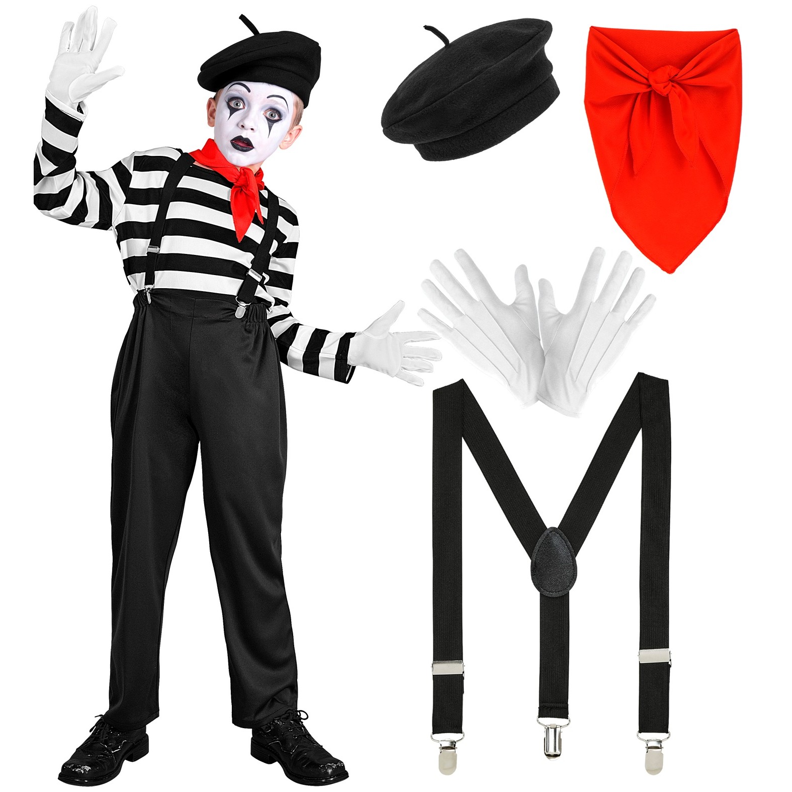 Costume includes shirt, pants, braces, neckscarf, gloves & hat