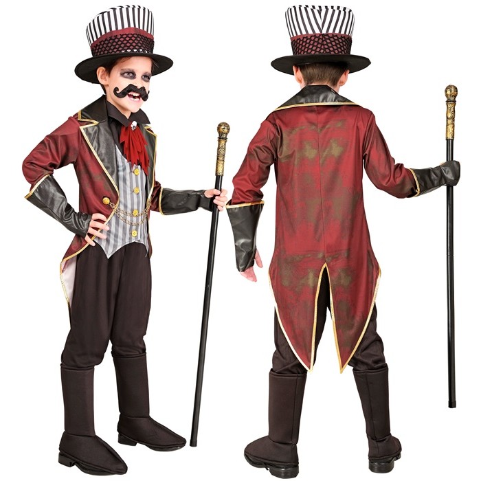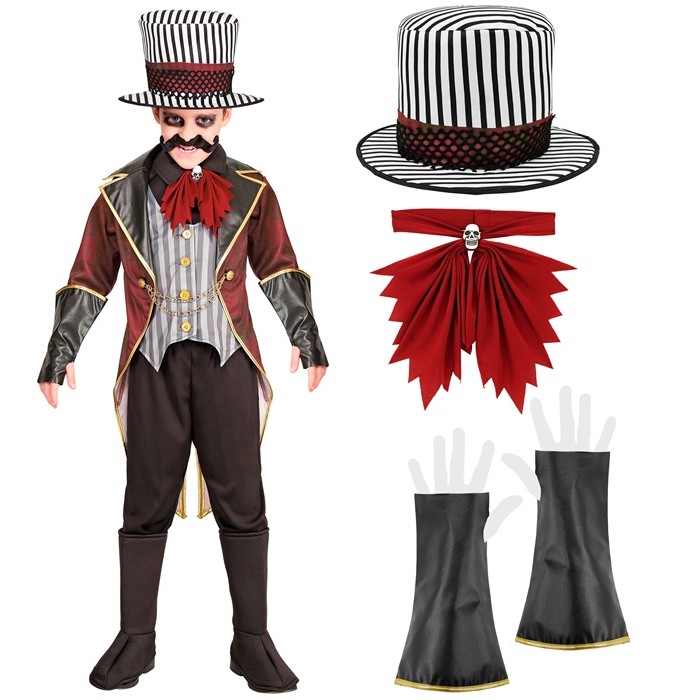 Costume includes jacket with vest, skull jabot, gloves & hat