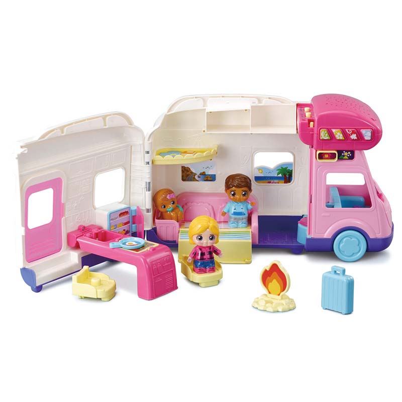 2-in-1 campervan and campsite toy with day and night mode! Includes Mummy, Daddy and Baby! Features beautiful light projections, sounds, fun phrases, campsite accessories and more!